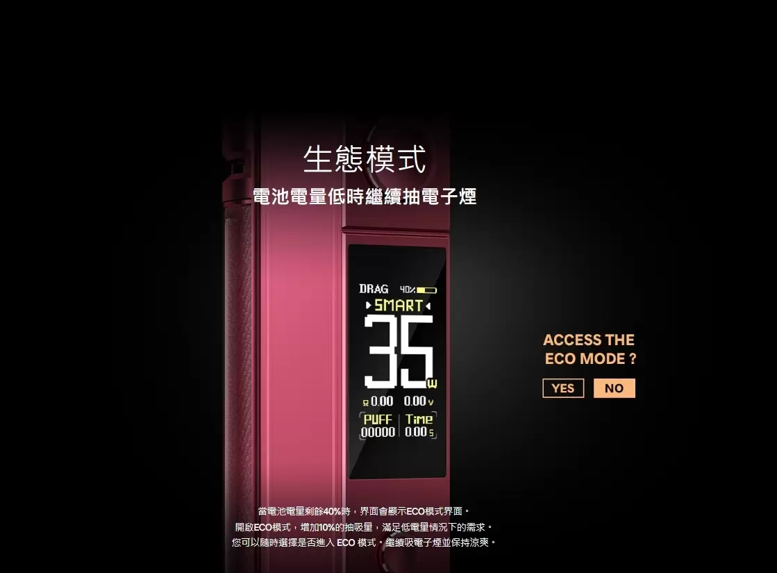 通過獨特的氣道和雙合一技術使氣流順暢並增強風味。ECO模式增加10%的抽吸量,滿足低電量情況下的需求。此外,集成緊湊的尺寸比 DRAG X 小 15%。