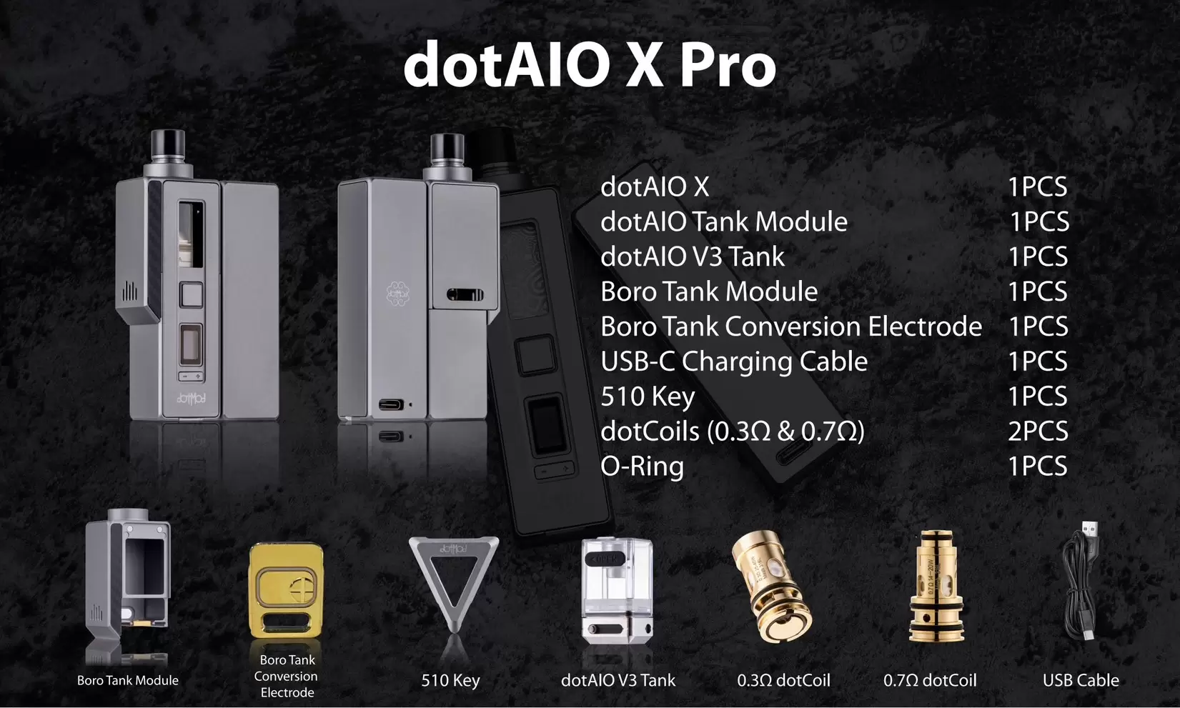 - 1 x Boro Tank 轉換電極(僅限 Pro 套件)