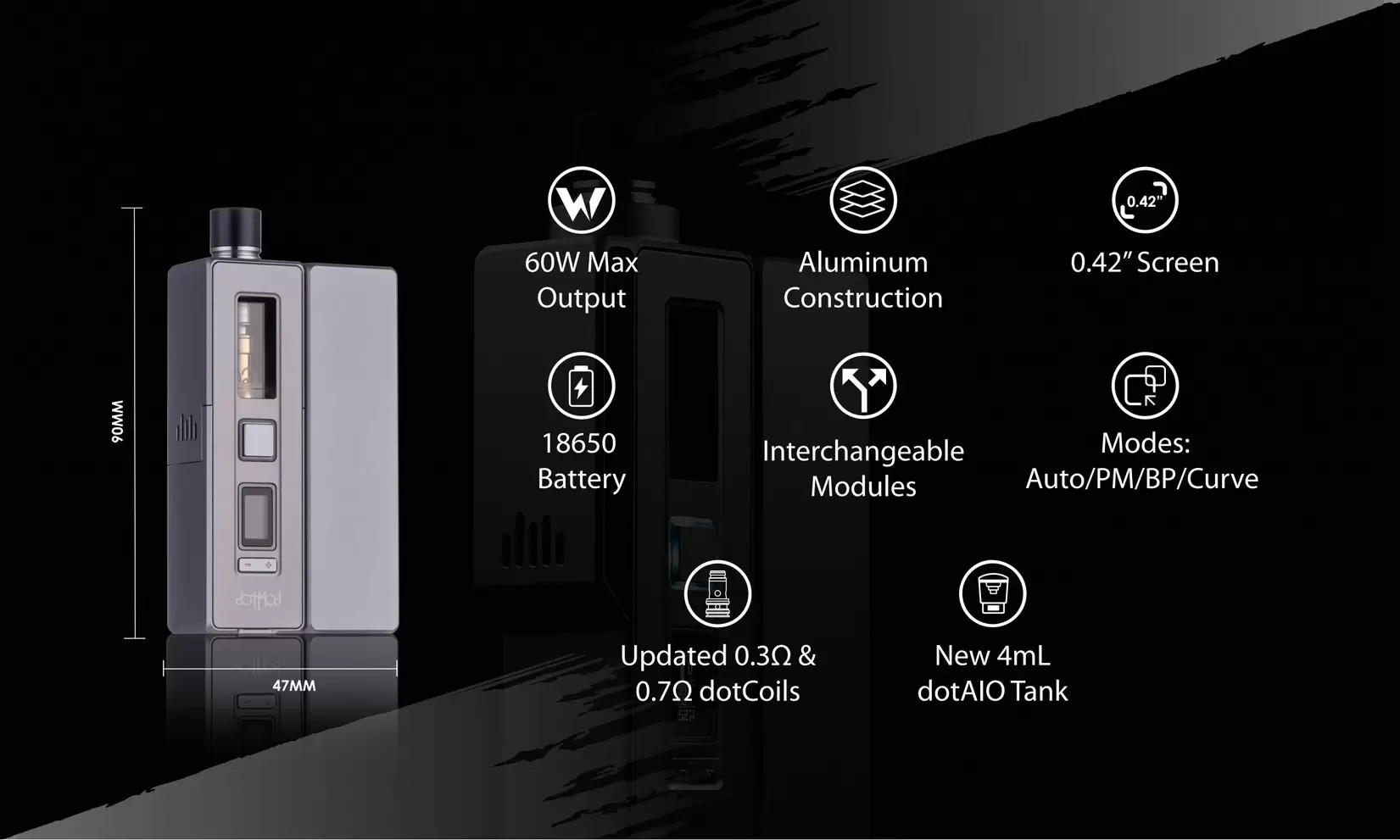 - 全模組化設計: dotAIO X 採用創新的模組化設計,允許用戶無縫切換不同的吸煙風格。無論您偏好 dotAIO 霧化器、Boro 霧化器,或是您的 RDA,dotAIO X 都能輕鬆滿足您的需求。只需更換霧化器模組,並輕鬆重新組裝,即可實現個性化的吸煙體驗。