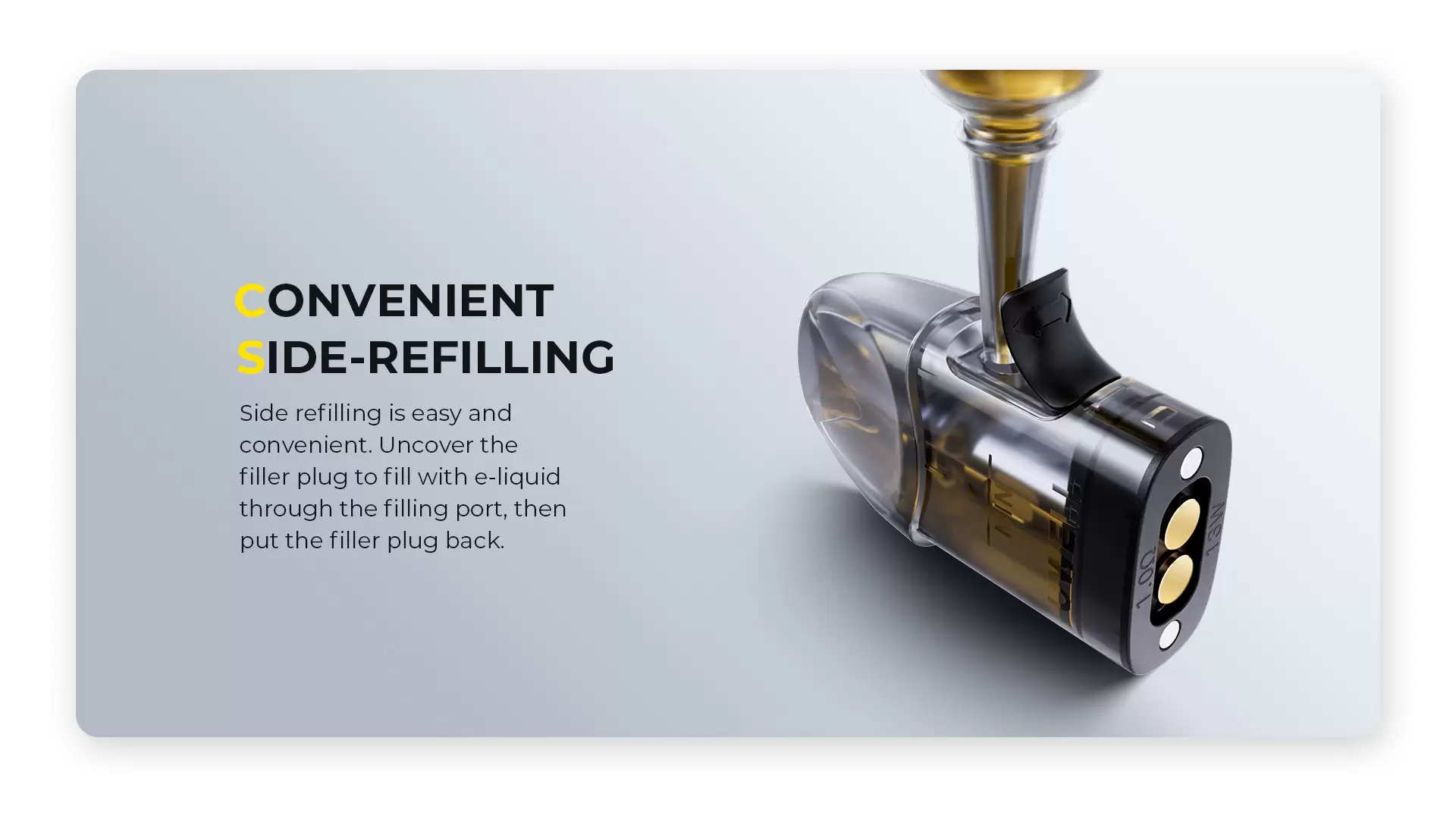 - 側面加油設計:2ml 煙彈容量,側邊填充防漏且方便。
