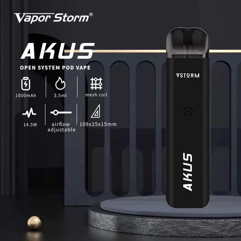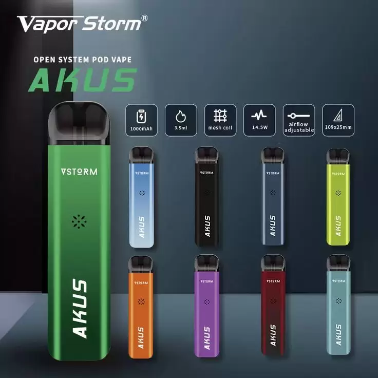 Vapor Storm AKUS 是一款結合時尚外觀與強勁性能的 Pod 系統電子煙,提供可調式氣流、Type-C 快充與多款顏色選擇,是日常攜帶與使用的理想之選。