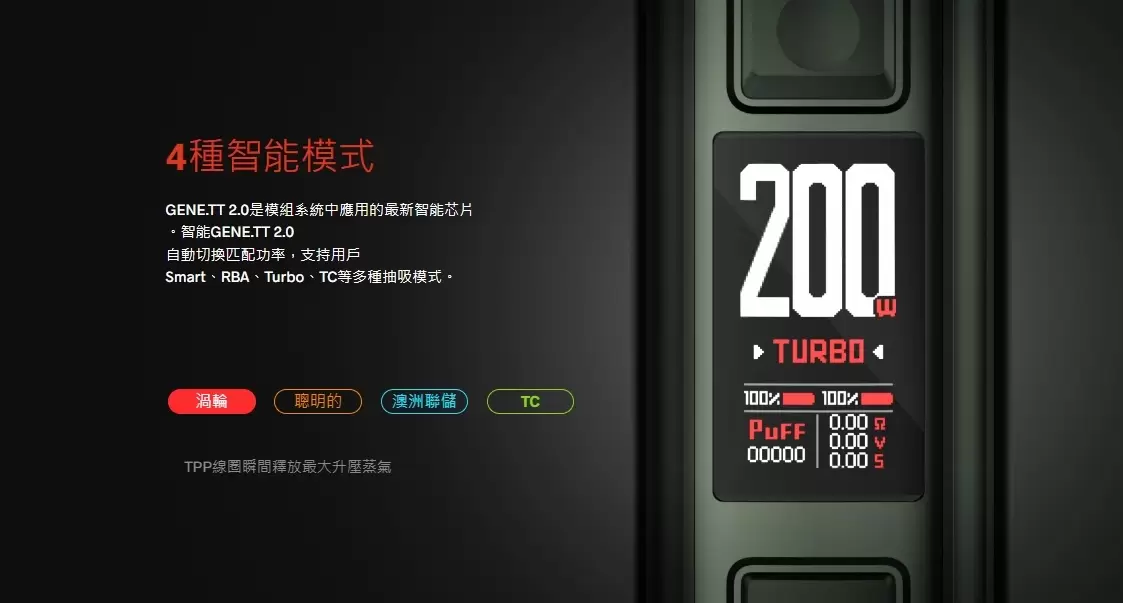 • 高達 200W 功率輸出:滿足從小煙到大煙的各種霧化需求,自由調整瓦數、打造專屬吸感。